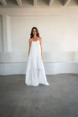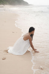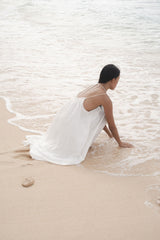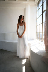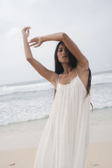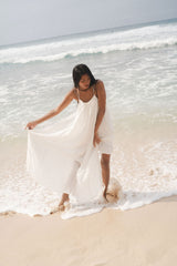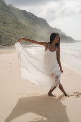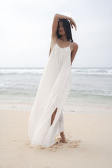Our Peponi dress features flowing swathes of feather light organic cotton. A mini inner slip allows coverage while the floor length skirt boasts a semi sheer allure.