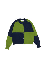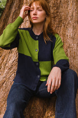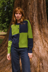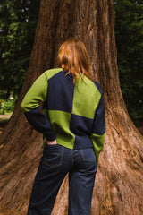 The block colour intarsia pattern in sweet Almond cream and rich mossy green is crafted from high-quality Geelong Lambswool which is comparable to the softness of cashmere. Its relaxed silhouette makes it an ideal layering piece.