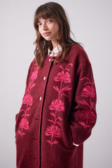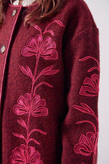 The Astrid Coat - crafted in a rich autumnal shade of dark red. Featuring intricate botanical embroidery across the front, sleeves and back. Mid length coat. Side pockets. Finished with buttons.