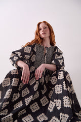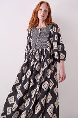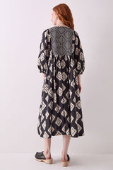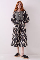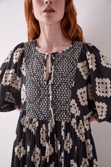 The Kaira Cotton Midi Dress features a contrast embroidered bib on both the front and back, Crafted from lightweight cotton voile, it drapes softly with gentle volume through the body for a relaxed, flattering silhouette. The dress is finished with voluminous 3/4 sleeves and delicate pintucking at the shoulders for added texture and shape. Comes with a slip.