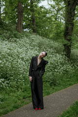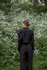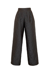 Moon trousers hold a structured silhouette emphasized by wide-leg. The trousers feature a fitted waistband and front pleats. Unique jacquard fabric catches light and a straight cut creates strong architectural lines.
