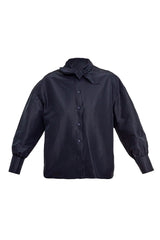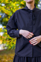 The elegant NILA shirt is crafted from crispy navy silk blend taffeta. The silhouette combines a loose bodice, sleeves with cuffs, and bold bow collar. A unique fabric structure creates architectural illusion and embody femininity.