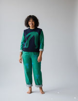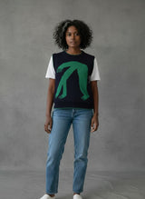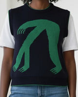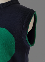 Step into bold comfort with our organic cotton knitted vest. This sleeveless jumper showcases a bold green figure on a navy background, finished with contrast green trim. Designed for multi-season wear, it layers effortlessly over shirts and dresses or works as a standalone statement piece in warmer months. A versatile style with a graphic edge, made to elevate your everyday wardrobe.