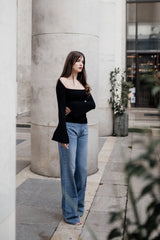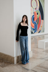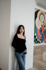 The wide neckline highlights the décolletage and the classic black shade allows for optimal styling, serving as both an underpinning for luxe layers and a standalone staple that can hold its own. Finished beautifully with a flared sleeve for a modern twist on a classic staple.