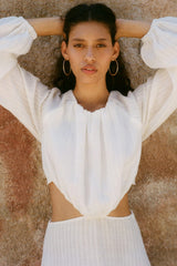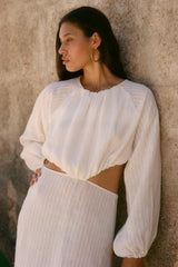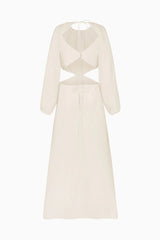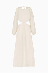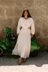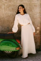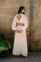 The Emilia Cut-Out Maxi Dress in off-white is crafted from subtly embroidered, eco-friendly linen for a maxi length. This staple dress features long, slightly puffed sleeves with elasticated cuffs for extra comfort. Details include cut-out elements, an alluring open back and an adjustable maxi-length skirt.