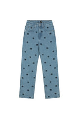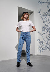 Non-stretch denim: 20% post-consumer recycled cotton, 30% hemp, 50% organic cotton.
