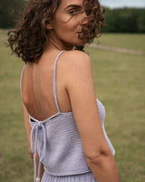 Handmade from soft, lightweight cotton, Varpeliai (eng. little bells) is our warm-weather ode to wildflower fields and carefree summer days. Featuring a minimalist cami silhouette, this top is elevated by delicate crochet straps that tie at the back for an adjustable, comfortable fit.