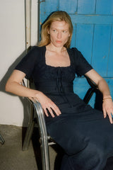 The Clementine Midi Dress in navy blue, crafted from midweight linen, combines romance and timeless style. Featuring a gathered chest detail, short puffed sleeves, and a body-fitting skirt that falls just above the ankle, this elegant dress also includes a side zipper and an adjustable tie at the chest for a custom fit. A versatile piece that effortlessly enhances any wardrobe.