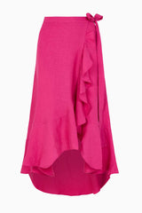 The Catalina Linen Wrap Skirt in hot pink effortlessly drapes around your body. It's crafted from lightweight, opaque linen and features a high-waisted silhouette. The flattering wrap design is accentuated by the ruffles and allows for easy size adjustments.