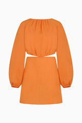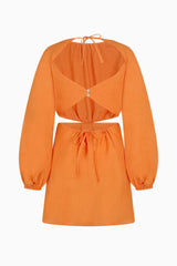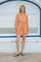 The Emilia Cut-Out Mini Dress in mango is made from sustainable linen in a fun orange hue. Designed for both style and comfort, it features long, slightly puffed sleeves with elasticated cuffs, alluring cut-out details, an open back, and an adjustable mini-length skirt. Perfect for special occasions, vacations, or effortless everyday dressing.