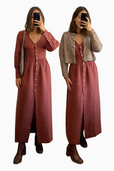 Its graceful floor-length cut, the puffed sleeves, and the accentuated waist-fit add this extra bit of elegance while the calming terracotta colour makes this linen maxi dress a laid-back statement piece.