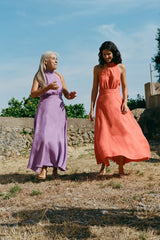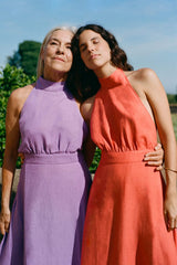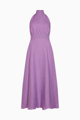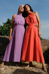 The Isi Halterneck Dress in purple is cut from 100% OEKO-TEX®-certified, sustainable linen. It has an elegant halterneck silhouette that is balanced by an open back and a voluminous skirt. The beautiful lilac colour makes this dress great for a summer wedding.