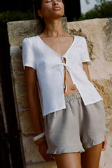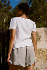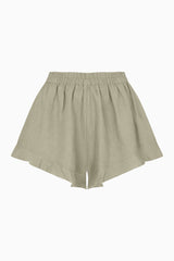 Crafted from breathable, opaque linen, the Paula Ruffled Shorts in soft oatmeal offer a flattering high-waisted silhouette with delicate ruffle detailing. The elastic waistband, made from eco-friendly organic elastic, ensures all-day comfort. Whether you're headed to the beach, relaxing at home, or squeezing in a quick workout, these versatile shorts are your go-to for effortless style and ease.