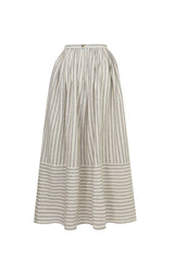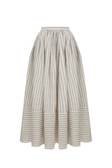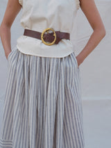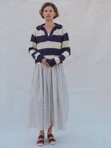 The Pippin Skirt is named for the versatile heritage apple variety which can be eaten fresh, used in cooking or made into cider, found in old English orchards. The Pippin Skirt is a breezy, long skirt gathered at the waist and with contrasting vertical and horizontal stripes. A beautiful, easy skirt for long warm days, to be dressed up or down at will.