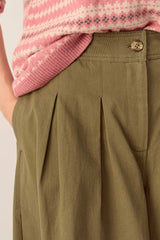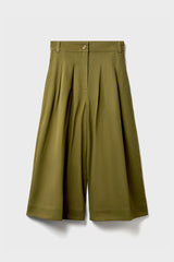 Crafted from cotton twill in a khaki green, this modern piece features a structured silhouette balanced with ease of movement. Designed with a wide hem and ¾ length, box pleats at the front and back waist seam add subtle volume and shape while maintaining a clean, contemporary line. Finished with practical side pockets and a refined fly-front fastening, it’s an effortless style for everyday wear.