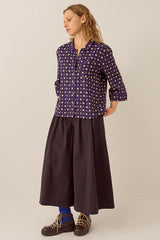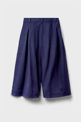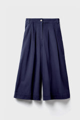 Crafted from cotton twill in classic navy, this structured yet wearable piece is designed with a modern silhouette that balances shape and movement. A wide hem and ¾ length cut create a clean, contemporary line, while box pleats through the front and back waist seam add subtle volume and ease.