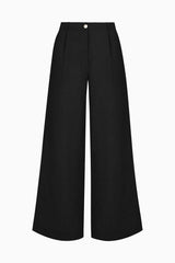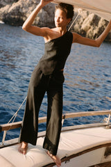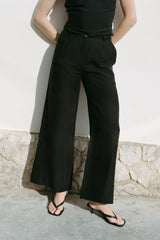 The Willow Wide-Leg Pleated Linen Trousers in black are a true wardrobe staple, cut from soft, sustainable linen. They have a mid-rise waist and fall to a fluid wide-leg, creating a classic and elegant silhouette. They close with a zip and a biodegradable mother-of-pearl button and feature two front pockets.