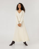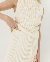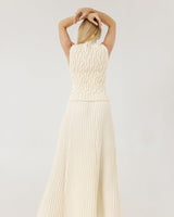 The cashmere-wool-cotton mix skirt is a statement piece, constructed from six joined panels wrapping around the body. Its knit texture naturally hugs the body and is designed for comfort and fluid movement. The unique and tactile texture of the Vagos Skirt fabric is enhanced with an extra thread of silk, which is plaited through, adding shimmer and a luxurious feel. The skirt has a rib trim at the waist, sits just above the hips, and finishes at mid-length. The garment is finished by hand-linking. Yarns are sourced from high-quality Italian suppliers working in sustainable, low-environment-impact production cycles.
