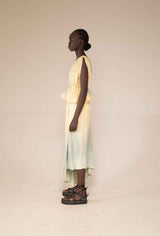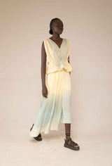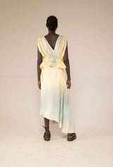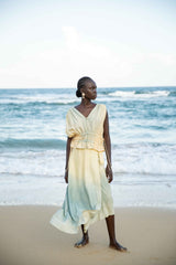 The wrap skirt features an asymmetrical design that can be worn in a variety of ways. Made from botanically dyed handloom moonga silk this skirt has been dyed with marigold petals and dipped in an indigo vat to create this ocean like ombre effect.