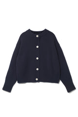 New for AW25, we've added colour to our signature Raye collection. This cardigan is a deep true navy. It's made from 100% certified, traceable British wool from native Bluefaced Leicester sheep, spun in Yorkshire and knitted in London - a truly British knit.