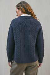 The style features intricate cable stitch patterns that highlight the rich heritage of traditional British craftsmanship.