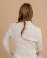 "Vanduo" means water and it truly reflects the feel and touch of this semi-sheer knit. Crafted from a luxurious blend of cotton and silk, this irregular rib top is designed for a close, body-hugging fit. Featuring a delicate transparent mohair detail at the cuffs and a mock neck finished with a rolled edge seam, Vanduo is inspired by the winding waterways and nature's organic lines. The weightless yarn feels incredibly soft against the skin, making it the perfect underlayer.