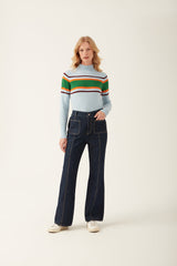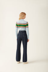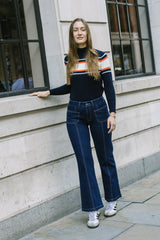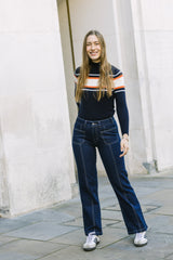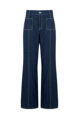 Made from recyled cotton with a little bit of stretch for comfort. This Patch Pocket Denim Jean has a slightly flared leg and seam detail along the front. Denim is a dark colourway