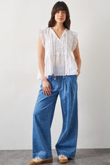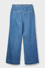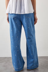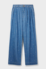 Our light wash Renia denim trousers featuring all-over embroidery, a decorative waistband, and embroidered pocket edges. Designed with two sewn-down pleats at the front for a gentle structure, they also include two patch pockets at the back with embroidered detailing. Slouchy relaxed fit.