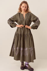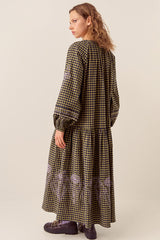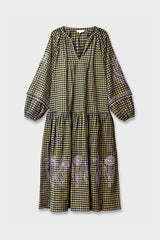Navy and olive yarn-dyed gingham check woven into crisp cotton seersucker, against contrast lilac chainstitch embroidery. An A-line midi, defined by structural details such as a dropped, gathered waistline, intricate pintucking on the front bodice, and tiered sleeve panels with an embroidered scallop trim. Soft gathering along the back neckline and cuffs, raglan sleeves, and an open V-neck ensure a relaxed fit.