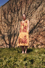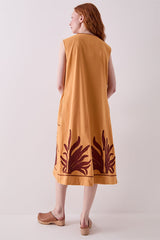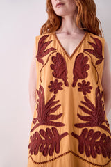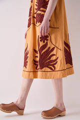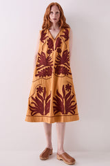 The Mella Dress is crafted from cotton and fully lined. Featuring a relaxed A-line silhouette, it falls to mid-calf with a flattering V-neckline. Bold burgundy appliqué adds rich texture to the ochre base. Side pockets.
