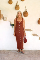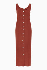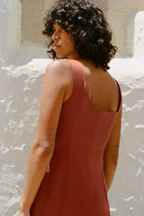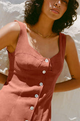 The Alice Bustier Dress in terracotta is cut from soft linen and closes with a front button closure made of responsibly sourced mother-of-pearl buttons. It's designed with structured cups at the close-fitting bodice and a fitted skirt that can be buttoned up to your liking.