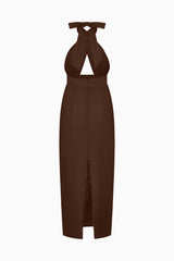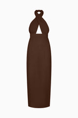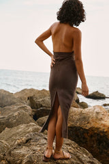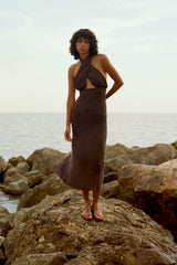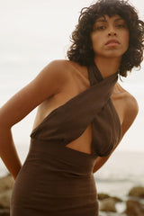 The Margot Criss-Cross Halterneck Dress in chocolate is cut for a body-hugging fit. It's made in Portugal from sustainably sourced linen. The alluring halter neckline crosses over the chest, is adjustable thanks to its tie-element and turns into an open back.