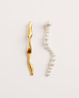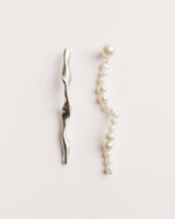 The Trama earrings explore contrast through a pair of deliberate mismatches. One earring takes form in recycled silver, its surface crinkled like pressed fabric, catching light and shadow in its folds. The other falls as a delicate line of freshwater pearls, arranged in a gently undulating thread. Together, they weave texture and movement into a sculptural dialogue.