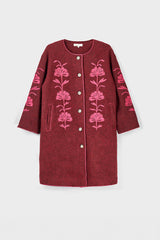 The Astrid Coat - crafted in a rich autumnal shade of dark red. Featuring intricate botanical embroidery across the front, sleeves and back. Mid length coat. Side pockets. Finished with buttons.
