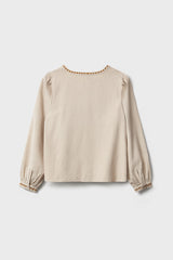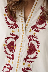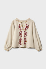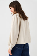 Soft cotton corduroy in cream with bold heritage motifs in dark paprika, bordering a delicate a embroidered trim along a mock-placket centre front. Relaxed fitting with a naturally open V-neck, and dynamic volume in sleeves through gathering at armhole and cuff seams. Full length sleeves, with shell button placket at cuff openings.