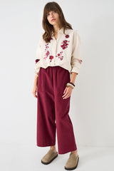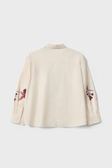 A classic tailored shirt with a relaxed fit, showcasing floral embroidery in rich berry tones upon a crisp cotton base in cream. Structural details include a point collar and button-down centre front, a back yoke, and wide cuffs with button-closure placket and pleating into sleeves. Full length sleeves. Shell button fastenings.