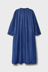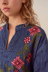A relaxed fitting denim dress in mid-wash blue with full length sleeves. Bold floral embroidery in tonal plum and dark olive borders a rounded V-neck opening and tiered felled seam detailing which nods to classic denim outerwear. Midi length. An A-line cut with soft gathering along the neckline ensures a dynamic silhouette. Midi length.