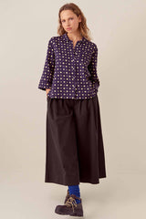Crafted from cotton twill in Navy. A modern, structured silhouette through a wide hem and ¾ length, with box pleats providing additional volume along the front and back waist seam. Two side pockets. Front fly zip and mock-horn button closure.