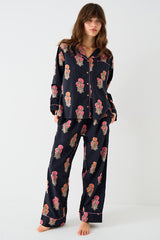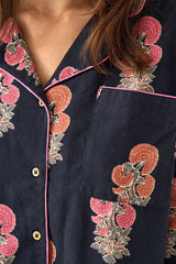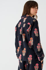 A return of our popular woodblock floral motif, printed in soft ochre and raspberry tones on a deep navy, cotton base. A classic shirt long-sleeved, featuring a revere collar and button-down centre front, paired with relaxed fitting, straight-leg trousers. Elevating details on both pieces include contrast piping and natural coconut buttons. Chest patch pocket. Elasticated drawstring waistband. Two side pockets.