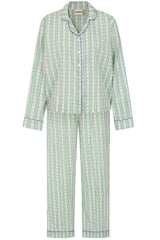 Our green ditsy stripe pyjamas are designed with a pink flower stripe and a soft cornflower blue piping, combining classic stripes with block printing motifs. They are handmade by artisans in Jaipur and come in a matching pyjama bag. Their oversized, boxy fit and supersoft cotton are perfect for cosy nights in. The fabric is hand printed so please allow for discrepancies in designs as each set is unique.