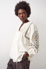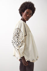 The Pavlina Embroidered Top, Made from lightweight, breathable cotton, this top features delicate pintuck detailing along the neckline. Intricate embroidery adorns the sleeves and shoulders, showcasing timeless craftsmanship in contrasting threadwork. Relaxed fit and scalloped hem.