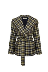 Detail - The Penrith Jacket is a mid-length jacket with shawl collar and purled tassels around the collar. It has front buttons and a waist tie, secured in place by two buttons at the back.