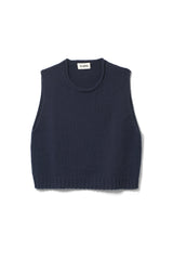 Our Raye knitted vest updated for Summer 2025 in a in a navy organic cotton and merino wool mix.