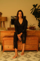 Introducing our Forest Pants, a stylish upgrade to your basic black pants! Featuring a chic button-up detail and unique motifs on the sides, these pants add an eye-catching element to a classic silhouette. When paired with the Forest Blazer and a chic bustier, they create a perfect ensemble for low-key festive catch-ups. Designed for comfort and versatility, the Forest Pants can easily transition from casual to polished. Elevate your holiday gatherings with this stylish combination that blends comfort and sophistication seamlessly. Paired here with Forest Blazer or Forest WrapTop.