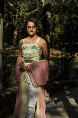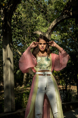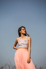 The Palm bustier is manually embroidered with rare botanical motifs and then embellished with beads on sequins to add dimension. The straps and the ends of the bustier are outlined with diagonal embroidery in a contrast colour for detailing. Lavender palm bustier paired here with a silver lining skirt and Lemon Palm bustier with distressed denims.