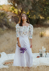 Made out of fully embroidered fabric with schiffly technique to punch holes, and then printed with our Summer Herbs print, this square neck top can lift up a mom jeans look. Pair it with white pants, skirt or your good old jeans. Its a versatile piece buttoned up with coco shell buttons that can spruce up your look and your day. Paired here with Summer White bucket pants.