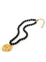 This statement necklace is one of the most powerful pieces of the collection. Beyond the harmony of the deep black onyx beads and the gold plated pendant, the spiral form symbolizes the ancient journey of returning to ourselves. The necklace offers a dramatic yet subtly feminine presence, evoking the timeless rhythm of folk traditions.