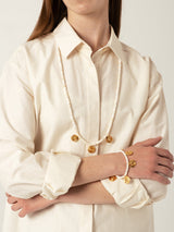 This limited statement necklace is a standout piece of the Origin collection. The delicate opal beads and the golden spiral elements create a pleasant harmony, lightweight yet full of character. Especially stunning against sun-kissed skin, with an airy dress. It radiates natural femininity and a sense of summer freedom. A unique piece of jewelry that brings individuality to any outfit.