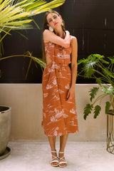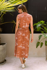 Arizona shirt dress features a classic shirt-style design with a collar and buttons down the front, giving it a timeless and sophisticated look. The sleeveless cut makes it perfect for summer days, and the flattering silhouette with cut out details and fringes add that perfect amount of detailing. The unique Arizona print showcases the beauty of the American Southwest, with terracotta-colored desert landscapes and iconic cacti. The earthy tones of the print complement the terracotta color of the dress, creating a cohesive and stylish look.This dress is versatile enough to be dressed up or down, making it perfect for any occasion. Pair it with sandals for a casual daytime look or dress it up with heels for a night out. It's also perfect for transitioning from the office to after-work drinks.The practical design includes side pockets for added convenience, allowing you to carry your essentials with you wherever you go. The lightweight fabric is easy to care for and can be machine washed for easy maintenance.