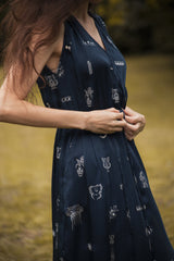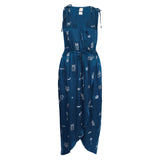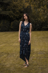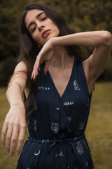 This Sleeveless Wrap Dress is designed for the modern woman who appreciates both comfort and style. The wrap-style bodice gently cinches at the waist, allowing for a customized fit that flatters your figure. With its sleeveless design, this dress is perfect for layering. The surplice neckline adds a touch of femininity, and the dress ties at the side, creating a classic wrap silhouette. The flowing skirt gracefully drapes to a knee-length hem, ensuring ease of movement and an elegant sway with every step.The Athena Wrap Dress in Silver Lining Print is a versatile addition to your wardrobe. Whether you're attending a garden party, a wedding, or a romantic dinner, this dress is an exquisite choice that exudes timeless charm and a touch of enchantment.Wear it with your favorite sandals for a casual yet sophisticated look, or dress it up with heels and statement accessories for a more formal affair. Regardless of how you style it, this dress will ensure you radiate confidence and elegance with every step you take.